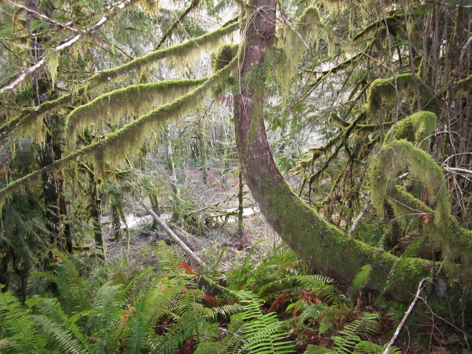 I had seen Laura and Jack's campsite several years earlier, perched above the creek at the edge of the re-prod. It took a keen eye to notice anything there in the woods and we probably found the site because the replanted trees were not even head high. This was Tuesday. No one had yet seen Laura. Her familiar haunts at the library and along the road, looking for a ride to town, had yielded nothing. I had offered to look in the woods if all else failed.The day was clear, actually sunny after days of torrential rains. It seemed a good day to find Laura. I took the lead. Down an overgrown trail through the trees, which two years later were now way above our heads. I couldn't recognize anything. We stumbled through underbrush, our feet caught by tripping blackberry vines, our clothing catching on the large thorns of the more infamous Himalayan's. At one point we found a cache of something secured under black plastic. It had all the tell-tale signs of Laura and Jack, right down to the orange baling twine. We must be close to their campsite.We made it to the edge of the trees, to a site that was level and could have been a camp at some point. But not now. There was nothing to show residence. There were paths down to the creek. Were these deer trails or steps for human access? The underbrush was replaced with moss and ferns so it was easier to look along the banks. Nothing to see except wildness.Climbing down and crossing the creek for a different view, we came across Laura's work. A bridge of logs, with railings tied for safety, made access to the county road possible from the forest side. Otherwise one had to take the long way around on a logging road that crossed the only other bridge over the creek for 2 miles. The recent rains had cast up several trees against the frame, but when we inched along the fallen logs, the bridge felt sturdy enough.